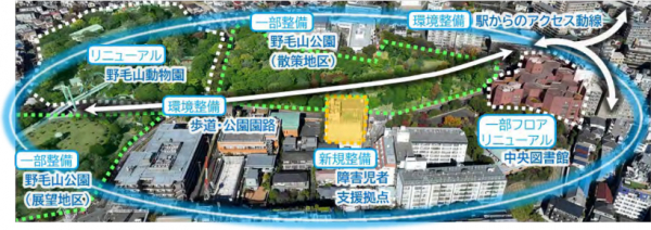 野毛山地区は「誰もが学び、楽しみ、交流し、理解しあえるインクルーシブなまちづくりの展開」のエリアコンセプトに基づき、施設整備やリニューアルが進められています。