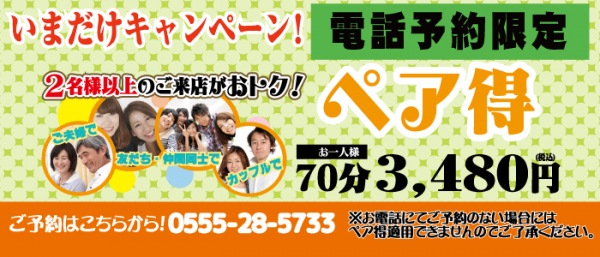 【富士吉田店】ペア得キャンペーン! おひとり様70分 3,480円(税込)