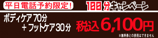 平日限定100分キャンペーン!はボディケア70分+フットケア30分の計100分セットメニューが6,100円(税込)とお得に受けられるキャンペーンです!