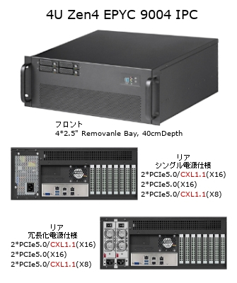 (4U ラックマウント インダストリアルPC, LGA-6096 Zen4 EPYC 9004 CPU, AMD SoC, 2*PCIe5.0/CXL1.1(X16)LPバス, 2*PCIe5.0(X16)LPバス, 2*PCIe5.0/CXL1.1(X8)LPバス, 2*M.2 NVMe SSD, 4*SATA/NVMeデバイス, 2*10GbE+2*GbE LAN, 850W 80Plus ゴールド規格ATX電源)