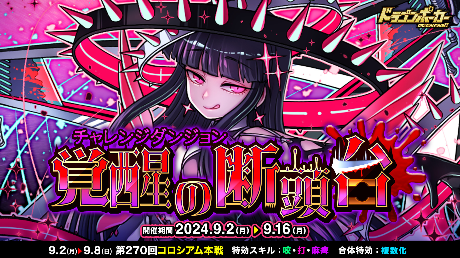 株式会社アソビズム(本社:東京都千代田区、代表取締役:大手智之)は、App Store・Google Playにて 好評配信中のリアルタイム合体カードバトル『ドラゴンポーカー』で、2024年9月2日(月)より新チャレンジダンジョン「覚醒の断頭台」を開催いたします。