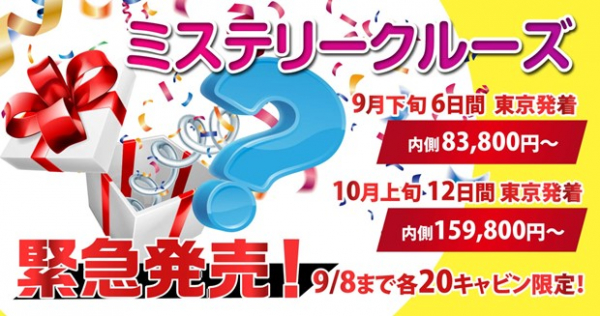 クルーズ予約サイト「ベストワンクルーズ」運営の株式会社ベストワンドットコム(本社:東京都新宿区、代表取締役:澤田秀太)は、9月下旬出発のミステリークルーズを1コース追加で設定し、本日より販売を開始いたしました。9月8日(日)までの期間限定、且つ20キャビン限定の販売となります。