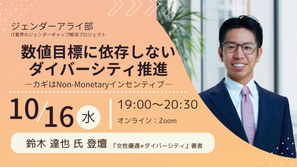 株式会社エーピーコミュニケーションズは、IT業界におけるジェンダーギャップ解消を目指す、企業の枠組みを超えた仲間が集うコミュニティ「ジェンダーアライ部」の第2回オンラインイベントとして、『数値目標に依存しないDE&I~カギはNon-Monetaryインセンティブ~』を2024年9月16日に開催いたします。講演では、書籍『女性優遇≠ダイバーシティ』の著者である鈴木 達也 様にご登壇いただきます。