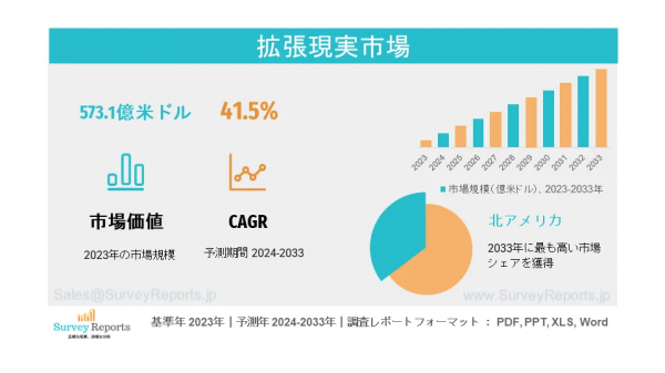 サーベイレポート合同会社は、2024年9月に調査レポート「拡張現実市場 コンポーネント別(ハードウェア、ソフトウェア);ディスプレイ別(ヘッドマウントディスプレイ、スマートグラス{シネマディスプレイグラス、XRグラス}、ヘッドアップディスプレイ{ハンドヘルドデバイス});用途別(航空宇宙・防衛、自動車、教育、Eコマース・小売、ゲーム・娯楽、ヘルスケア、産業・製造) - 拡張現実市場の予測評価を提供する世界市場分析、動向、機会、予測、2024-2033年」を出版したと発表しました。拡張現実市場の成長促進要因、市場機会、課題、脅威など、いくつかの主要な市場ダイナミクスを紹介しています。