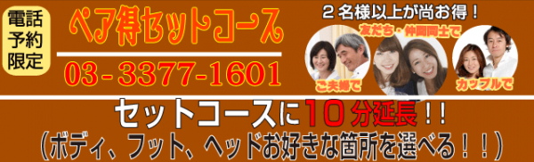 ペア得セットコース!は通常のセットコースに10分延長ができるお得なキャンペーンコースです!(ボディ、フット、ヘッドお好きな箇所を選べる!!)