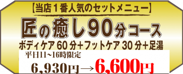 平日限定!匠の癒し90分コースはボディケア60分+フットケア30分+足湯の90分が通常6,930円(税抜)のところ6,600円(税込6,800円)とかなりお得な当店一番人気のセットメニューです!