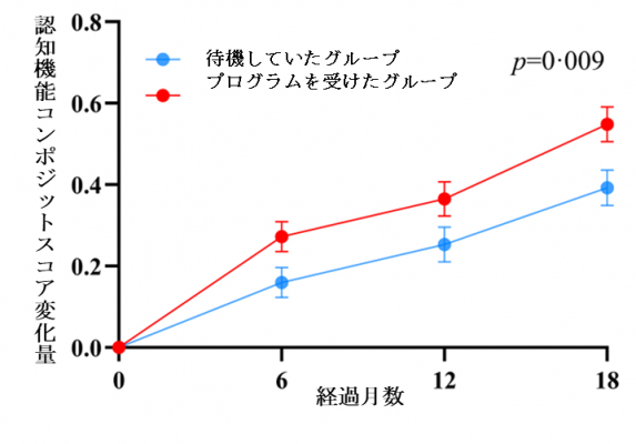 待機していたグループの認知機能(青線)に比べてプログラムを受けたグループの認知機能(赤線)は有意に改善していた(図の上方に行けば行くほど改善を示す)。
