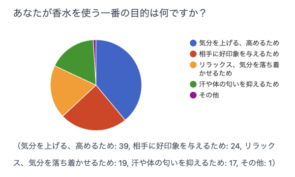 僅かな差ではありますが、香水を使う一番の目的は、他人に対してよりも、自分に対して使う人のほうが多いことが分かりました。