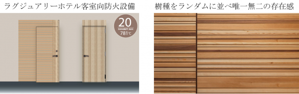 「ラグジュアリーホテル客室向け防火設備ドア」は、高級・上質な質感を表現しつつ、製造過程で発生する切り落とし材を扉と壁面に使用した環境に優しいドアです。様々な樹種をランダムに並べることで、唯一無二の存在感を表現しています。またラグジュアリーホテルでの採用が多いSALTO社製(スペイン)ホテル錠を採用し、20分遮炎性能、T3等級の防音性能を兼ね備える高付加価値の商品となっています。