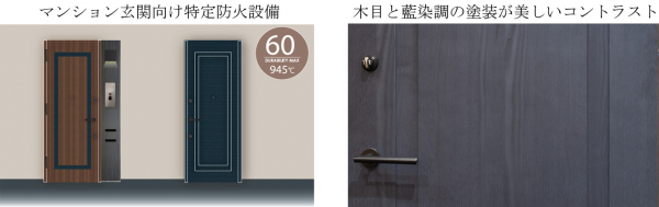 「マンション玄関向特定防火設備(内廊下タイプ)」は、木製ならではのフレキシブルな表面材を選定するとともに、藍染調の染色塗料を使用。ウォールナットの木目と藍染の美しいコントラストを演出しています。60分の遮炎性能、T2等級の防音性能・B種防犯性能(対応可)・耐震性能(D-3等級相当)でプレミアムマンションに相応しい商品となっています。