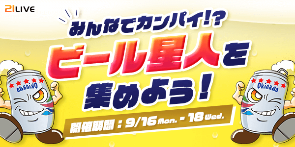 株式会社エムアンドティーティー(本社:沖縄県北谷町、代表取締役:井藤 三知子)が運営するエンターテイメント・ライブ配信アプリ【21LIVE(ニーイチライブ)】URL: https://21.live では、9月16日から9月18日にかけてライバーイベント『ビール星人を集めよう!』を開催いたします。