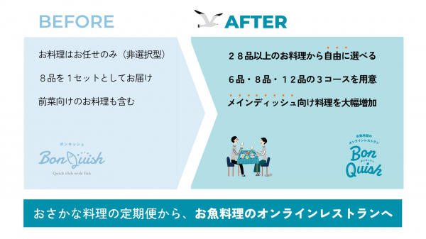 リニューアル前は、毎月異なる料理をお届けする非選択型の定期便サービスでした。様々な料理を分け隔てなく楽しんで頂きたいという想い、さらに魚は他の食材とは異なり、水揚げ量や季節性に左右される自然の食べ物だからこそです。しかし、「好きな料理を好きな時にリピートしたい!」「ライフスタイルにあったメニュー数にしたい!」という数多くの声を頂き、真摯に検討を行ってきた結果、お好きな料理を選べる自由選択型のサブスクリプションモデルの導入に至りました。お客さまのライフスタイルにあわせて、よりお楽しみいただくことができます。