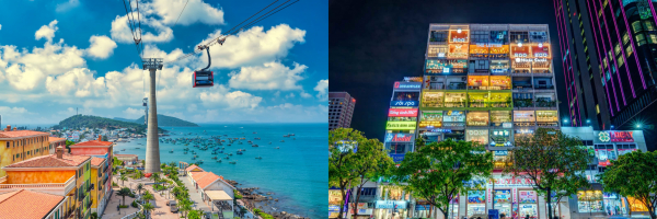 フーコックのホントム島に向かうケーブルカー(左)とホーチミンにあるカフェアパートメント(右)