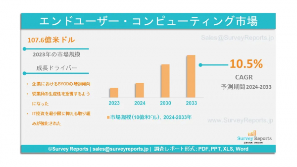 サーベイレポート合同会社は、ソリューション別(仮想デスクトップインフラ、デバイス管理、ユニファイドコミュニケーション、ソフトウェア資産管理、その他)、サービス別(コンサルティング、サポート&メンテナンス、トレーニング&教育、マネージドサービス、その他)、展開形態別(オンプレミス、クラウド、その他)、組織別(大企業、中小企業、その他)、エンドユーザー別(I.T.、 通信, 政府, 小売, メディア & エンターテインメント, その他) - エンドユーザーコンピューティング市場の予測評価を提供する世界市場分析、動向、機会、予測、2024-2033年です。エンドユーザーコンピューティング市場の成長促進要因、市場機会、課題、脅威など、いくつかの主要な市場ダイナミクスを紹介しています。