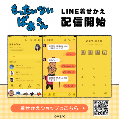 誕生から今年で20周年の絵本『もったいないばあさん』がLINE着せかえになってインクルーズより配信開始いたしました。黄色を基調にシンプルで使いやすいデザインとなっております。ぜひ、LINE着せかえでも「もったいないばあさん」の世界観をお楽しみください。