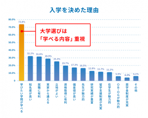 今の大学に入学した決め手(理由)は、73.8%の先輩が「学びたい学問が学べるから」と回答。昨年度の同調査(※2)では67.6%で、昨年比+6.2%の増加となりました。