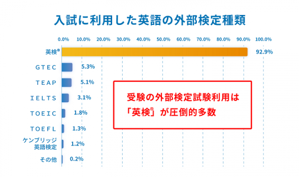 重要性を増す、英語の外部検定利用試験。入試で利用した外部検定試験は、圧倒的多数の「92.9%」が「英検(R)を利用した」と回答。外部検定利用は「まず英検(R)」という傾向が明らかです。