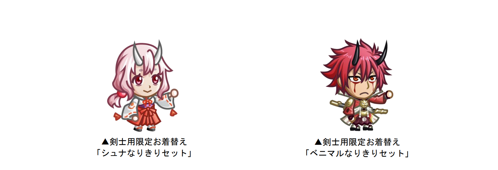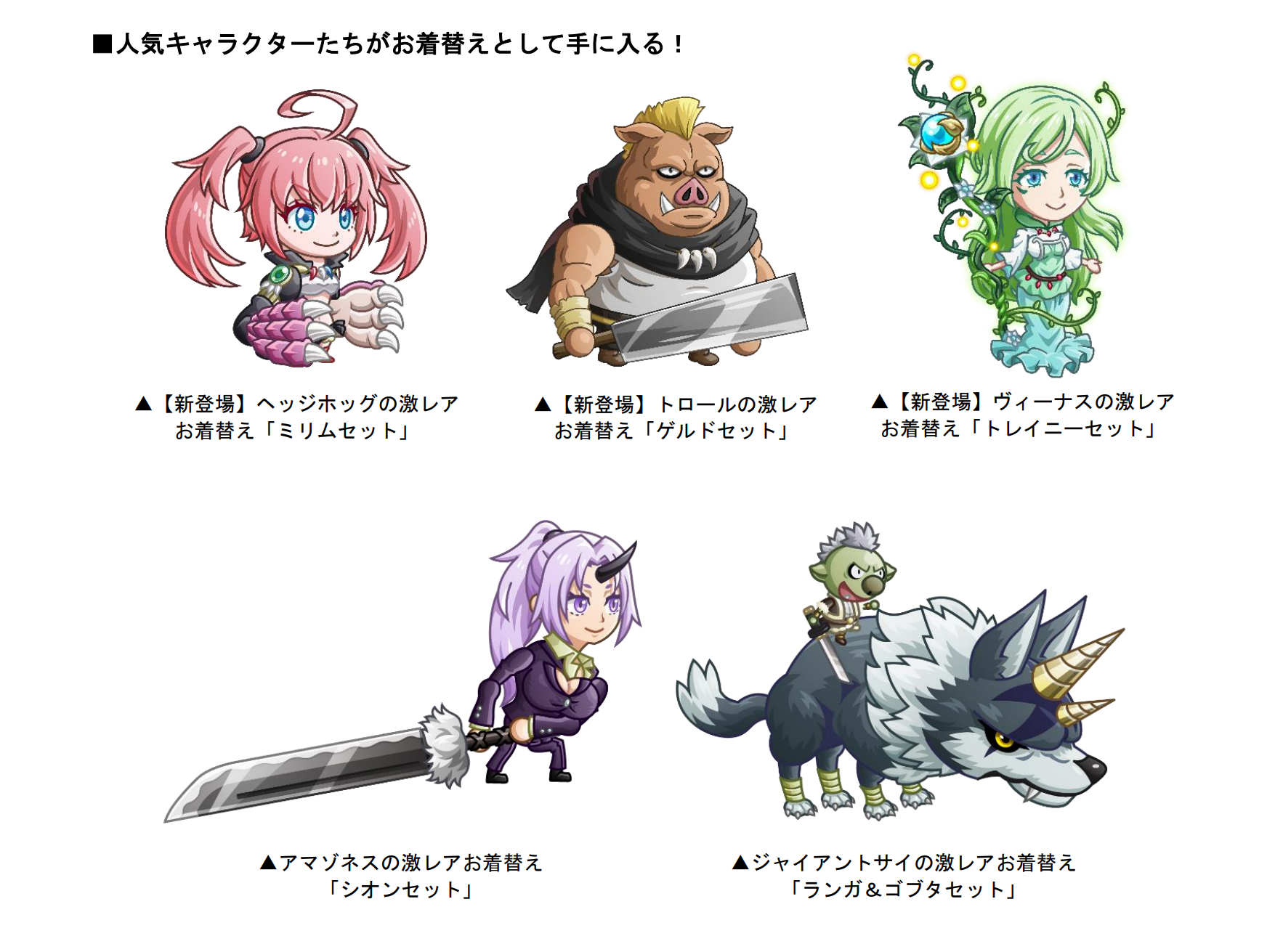 また、剣士用コラボ限定お着替え「シュナなりきりセット」「ベニマルなりきりセット」、 激レアお着替えとしてアマゾネスの「シオンセット」・ジャイアントサイの「ランガ&ゴブタセット」に加え、新しい激レアお着替えにヘッジホッグの「ミリムセット」・トロールの「ゲルドセット」・ヴィーナスの「トレイニーセット」も登場しますので、アバたまを割って、コラボ期間中にしか手に入らない限定キャラタマゴやアイテムを手に入れましょう!
