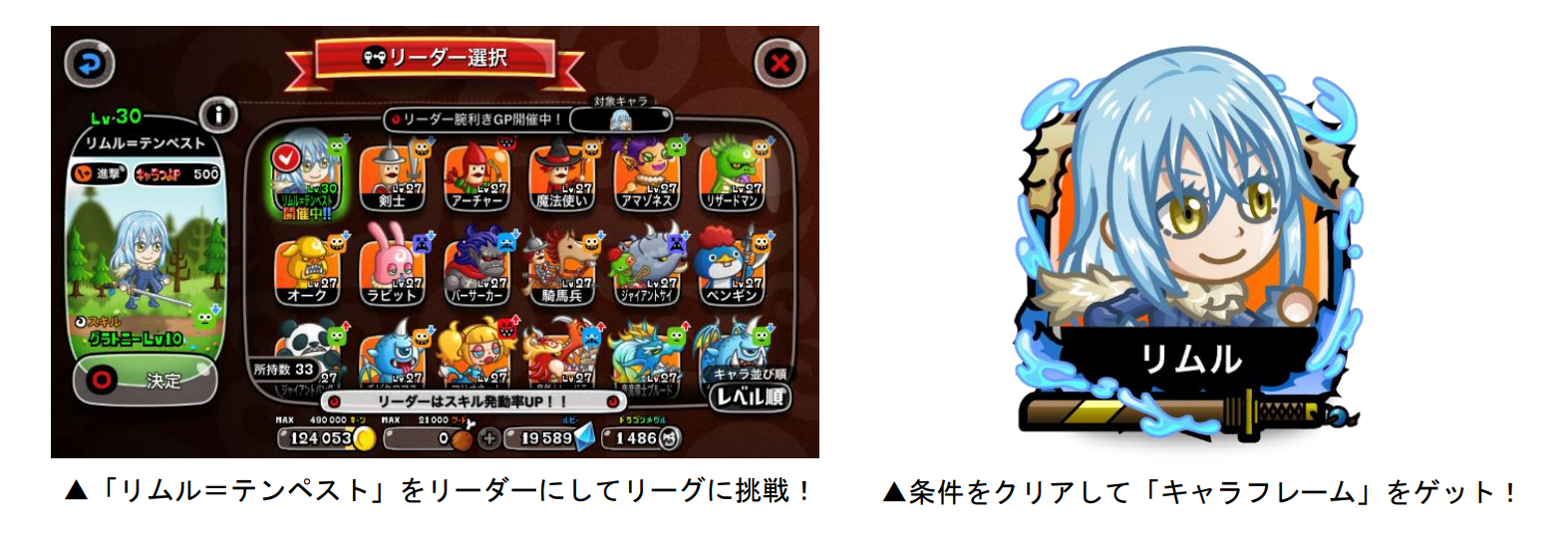 コラボ限定キャラ「リムル=テンペスト」をリーダーにしてリーグに挑む「リーダー腕利きGP」を開催いたします。バトルに勝利してより多くの「キャラフレP」を獲得したランキング上位者や条件を達成した方には、コラボ限定「キャラフレーム」が贈られます。