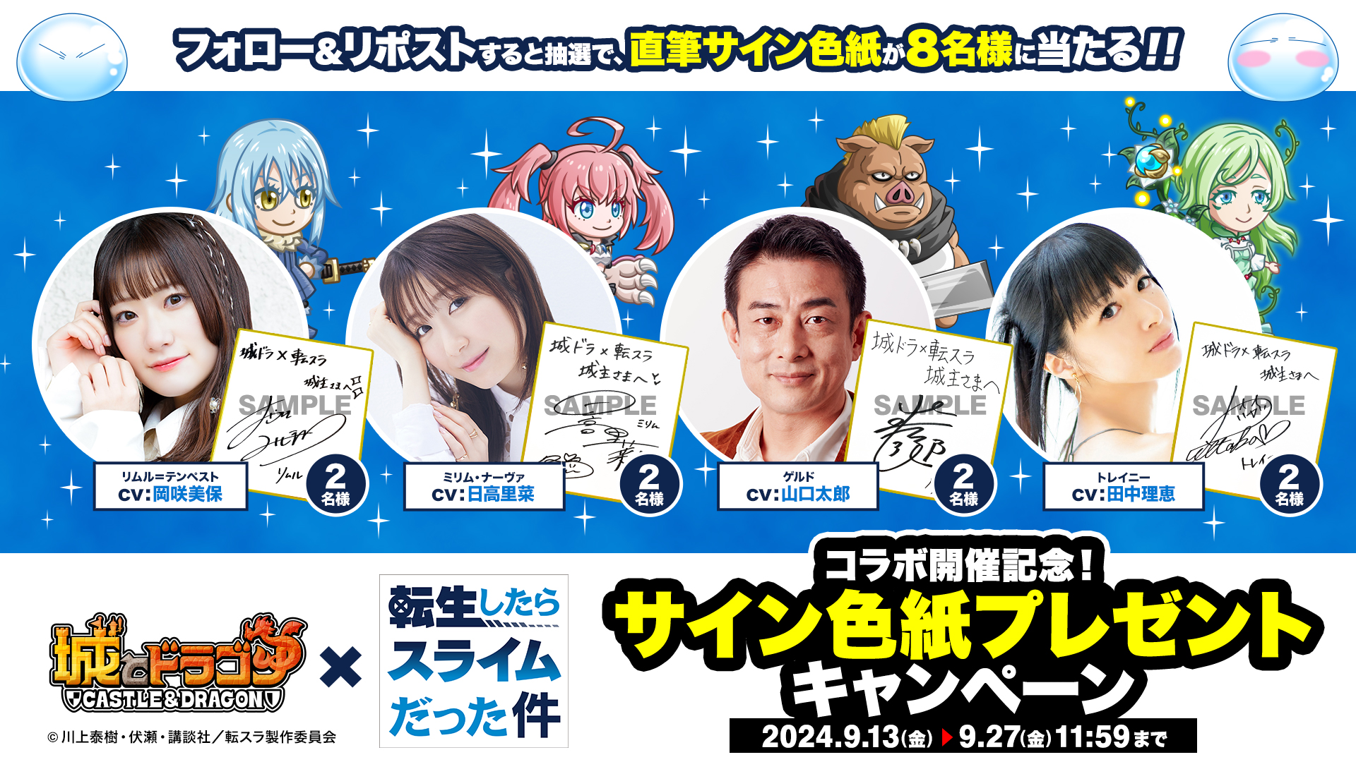 9月13日(金)より、コラボ開催を記念した「コラボ開催記念!サイン色紙プレゼントキャンペーン」を実施いたします。『城とドラゴン』公式X(旧Twitter)アカウントをフォローし、対象ポストをリポストしていただいた方の中から抽選で、岡咲美保さん(リムル=テンペスト役)、日高里菜さん(ミリム・ナーヴァ役)、山口太郎さん(ゲルド役)、田中理恵さん(トレイニー役)の直筆サイン色紙をそれぞれ2名様にプレゼントいたします。