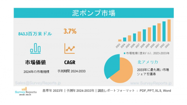 サーベイレポート合同会社は、泥水ポンプ市場の予測評価を提供する2024年9月発行の調査レポート「泥水ポンプ市場は製品タイプ別(二重、三重、五重)、駆動システム別(電気、燃料エンジン)、用途別(陸上、海上)に区分される - 泥水ポンプ市場の世界市場分析、動向、機会、予測、2024-2033年」を発表しました。泥水ポンプ市場の成長促進要因、市場機会、課題、脅威など、いくつかの主要な市場ダイナミクスを紹介しています。