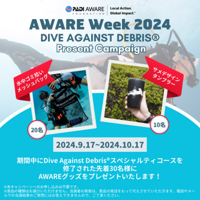 2024年9月14日~22日は今年で第7回となる 「AWARE Week」。そして、待望のDive Against Debris eラーニング日本語版がリリースされたのを記念して、Dive Against Debrisプレゼントキャンペーンを実施します。2024年9月17日(火)~10月17日(水)の期間中にDive Against Debrisスペシャルティコースを修了された先着30名様にAWAREグッズをプレゼントいたします。
