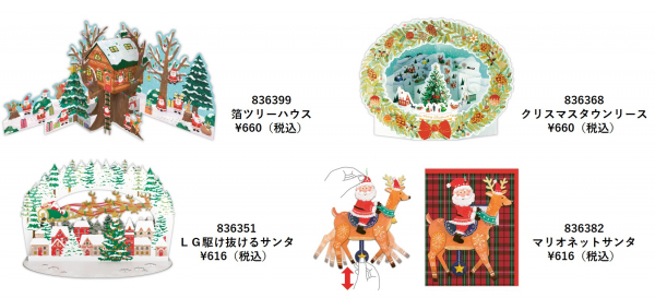クリスマスデコレーションにも人気の飾れるタイプは新たな立体の機構にチャレンジ。ツリーハウス型、新リース型、飾って遊べるマリオネットカードなど見て・飾って・遊んで楽しめるアイデア豊かなクリスマスカードをお楽しみください。
