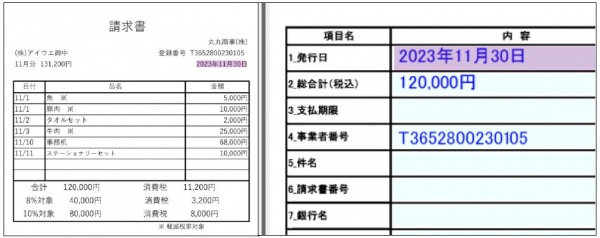 異なるレイアウトの非定型帳票から、必要な項目(例:日付、金額)を自動検出・認識します。