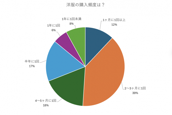 洋服の購入頻度について、「2~3ヶ月に1回」が39%で最多という結果になりました。理由としては、「シーズンごとに購入する」「セールの時期に合わせる」などの意見が多く見受けられました。