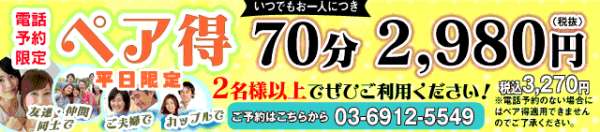 ペア得キャンペーン!は電話予約限定でおひとり様70分が3,280円(税込)とお得なキャンペーンです!
