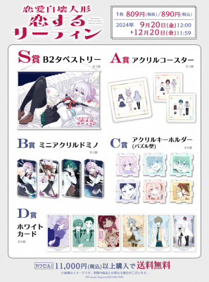 S賞は「サーティン」のイラストがB2サイズで堪能いただけるタペストリー。 A賞~D賞は作中から厳選したコマや、カラーイラストを使用したデザインとなります。恋するドールたちの、「カワセルくじ」でしか手に入らない限定グッズをぜひお見逃しなく!