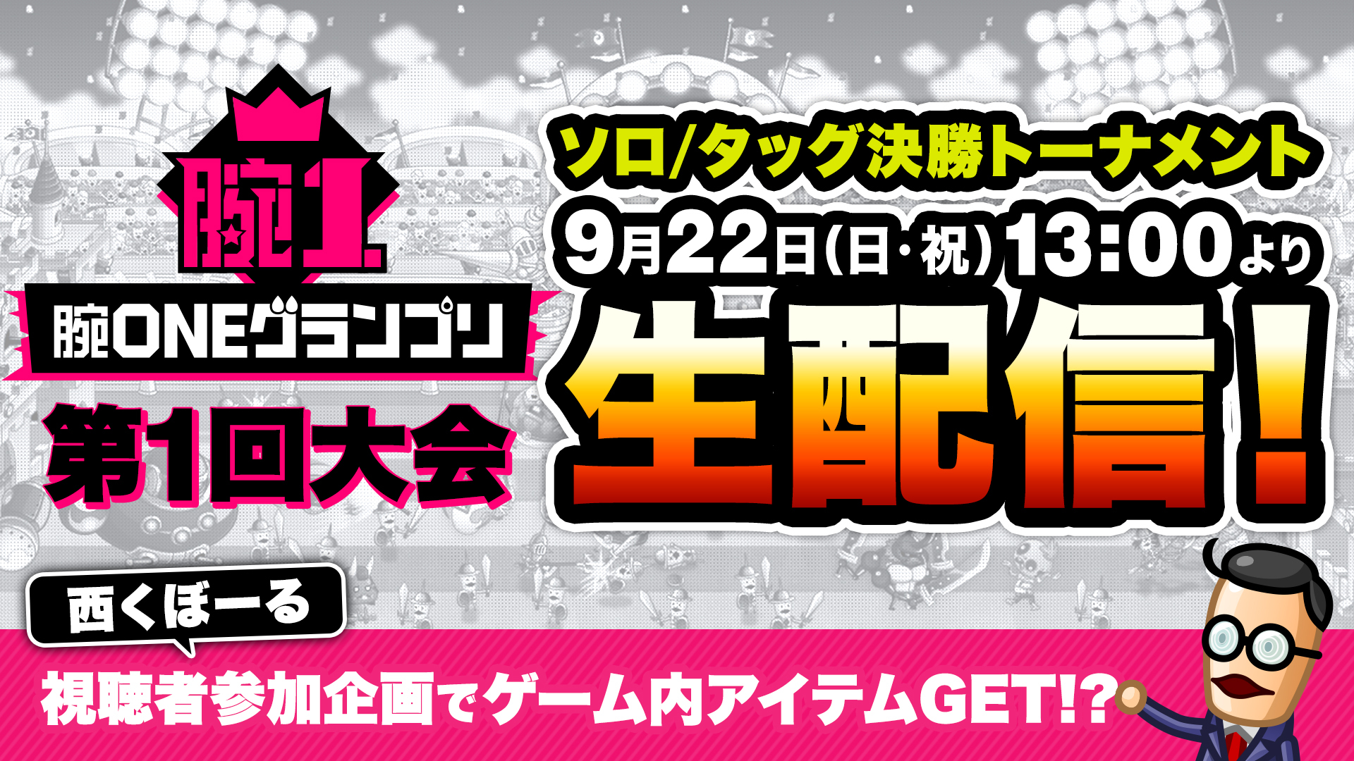 2025年2月15日(土)に東京にて開催される「城ドラフェスティバル2024-2025」。その「腕ONEグランプリ 王者決定戦」の出場へ向けた「腕ONEグランプリ第1回大会 ソロ/タッグ決勝トーナメント」の模様を、2024年9月22日(日・祝)13:00より『城とドラゴン』公式YouTubeチャンネルにて生配信いたします。ソロ優勝者には10万円、タッグ優勝チームには各メンバーに5万円の賞金を授与!また、配信中には『城ドラ』ユーザー全員がもらえるゲーム内アイテムをかけた視聴者参加型企画「西くぼ~る」も実施します。今回はクイズ形式で、視聴者の多数決で選ばれた選択肢の正解数に応じてアイテムがもらえるチャンスの数が変わりますので、ぜひリアルタイムでご観覧ください!