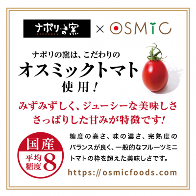 宅配ピザ「ナポリの窯」(株式会社ストロベリーコーンズ 本社:港区芝、代表取締役:宮下雅光)は、株式会社OSMIC FOODS(本社:中央区日本橋茅場町、代表取締役社長:西野則幸)が展開する高糖度フルーツミニトマト『OSMICトマト』を多数のメニューで導入いたしました。