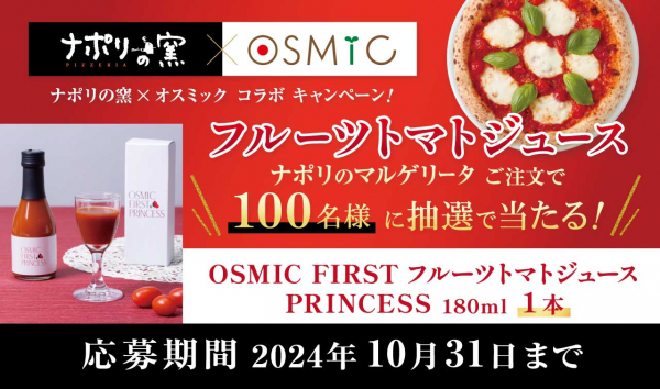 ナポリの窯・ストロベリーコーンズ注文&クーポンアプリから、「ナポリのマルゲリータ」をご注文いただいたお客様の中から抽選で、OSMICFIRSTフルーツトマトジュースをプレゼントいたします。詳細はナポリの窯のホームページまたは、アプリをご覧ください。