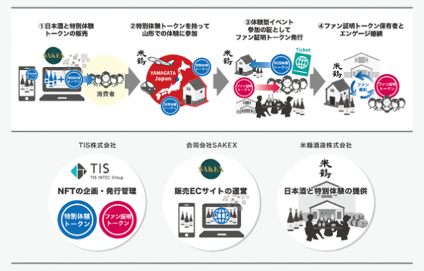 TISインテックグループのTIS株式会社(本社:東京都新宿区、代表取締役社長:岡本 安史、以下:TIS)と合同会社SAKEX(本社:大阪府吹田市、代表:小松 冨士子、以下:SAKEX)は、米鶴酒造株式会社(本社:山形県東置賜郡、代表取締役社長:梅津 陽一郎、以下:米鶴酒造)が提供する日本酒と特別体験をトークン(NFT)として販売する実証実験を9月24日より開始することを発表します。