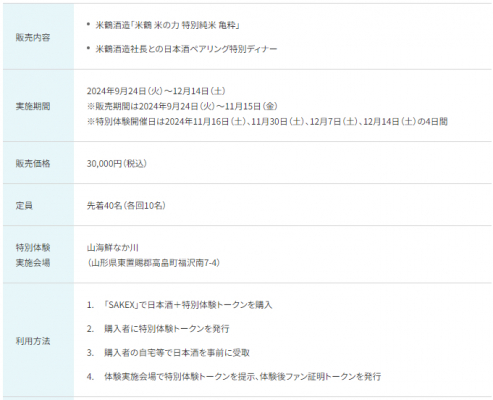 今回の実証実験における特別体験では、米鶴酒造の社長と日本酒の持つ魅力について語りながら、体験日限定で提供される初しぼりの特別酒と山形県産の食材を使ったコース料理とのペアリングが体験できる特別ディナーを提供します。概要は以下の通りです。