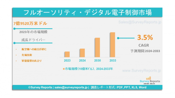 Survey Reports LLCは、2024年9月、フルオーソリティデジタル電子制御市場の予測評価を提供する調査レポート「フルオーソリティデジタル電子制御市場のセグメンテーション:種類別(集中型、分散型)、用途別(軍用機、民間機)、地域別(北米、欧州、アジア太平洋、中南米、中東およびアフリカ) - グローバル市場分析、動向、機会および予測、2024年~2033年」を発行したと発表した。フル・オーソリティ・デジタル・エレクトロニック・コントロール市場の成長促進要因、市場機会、課題、脅威など、いくつかの重要な市場力学に焦点を当てている。