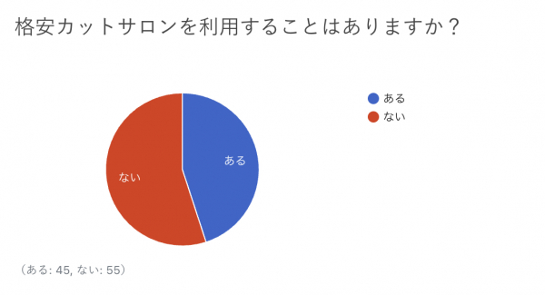 「格安カットサロンを利用することはありますか?」の回答は、“ある”が45%、“ない”が55%となり、半数には満たないものの4割を超える女性が格安カットサロンを利用しているという結果でした。