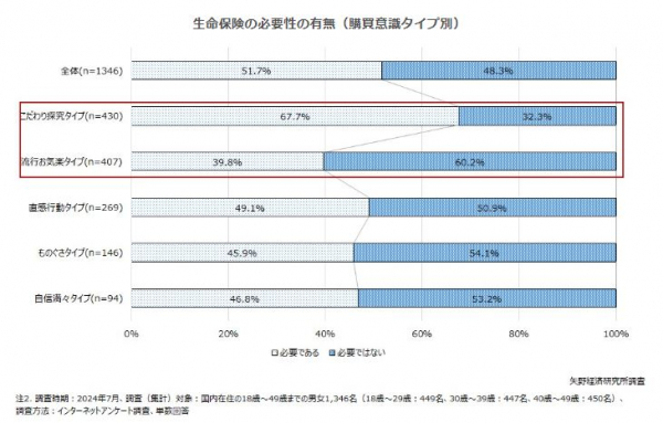 また、Z世代の構成比が高い「こだわり探究タイプ」と「流行お気楽タイプ」では、生命保険の必要性の有無について比較すると真逆の考えを持つことが示唆される結果であった。「こだわり探求タイプ」は「生命保険は必要である」の回答が67.7%と7割弱を占めた一方で、「流行お気楽タイプ」は39.8%と4割程度に留まった。