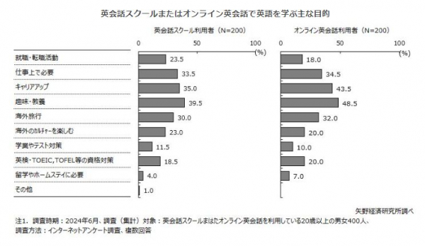 株式会社矢野経済研究所(代表取締役社長:水越 孝)は、語学ビジネスに関する消費者アンケート調査を実施し、多様化する学習ニーズを把握するとともに、英会話スクールとオンライン英会話のサービス利用状況やサービス乗換意向等を明らかにした。