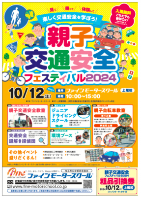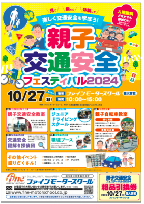 エコドライブを取り入れた新規運転免許取得者向けの教習『楽エコ教習』を2008年より実施している指定自動車教習所ファインモータースクール(株式会社臼田、本社:埼玉県さいたま市・代表取締役:臼田和弘048-641-7185、URL:https://www.fine-motorschool.co.jp )は、2024年10月12日(土)【上尾校】、27日(日)【西大宮校(旧指扇校)】両日、毎年恒例のイベント「親子交通安全フェスティバル2024」を開催します。ファインモータースクールのサポーター(教習指導員)やスタッフがさまざまなブースを設置し、交通安全やエコドライブの大切さ、くるまの楽しさをお伝えします。入場無料、雨天決行で、親子で一日楽しめるイベントとなっています。