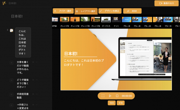 このサービスは、テキストや動画にしたいファイルをアップロードするだけで、AIが自動でデータを解析し、最適な構成のテキストとシーンを構成し動画にします。
