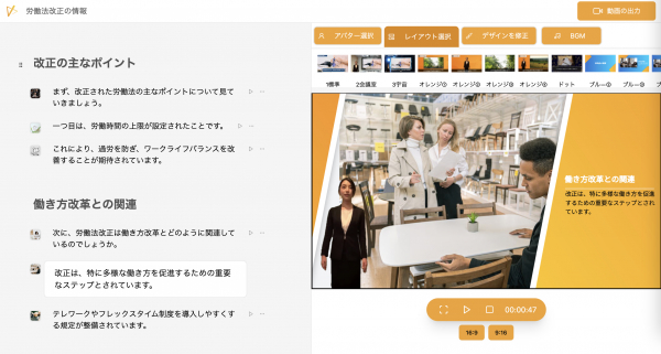 ・文章、URL、PDFやPowerPoint等様々な形式から動画を作成