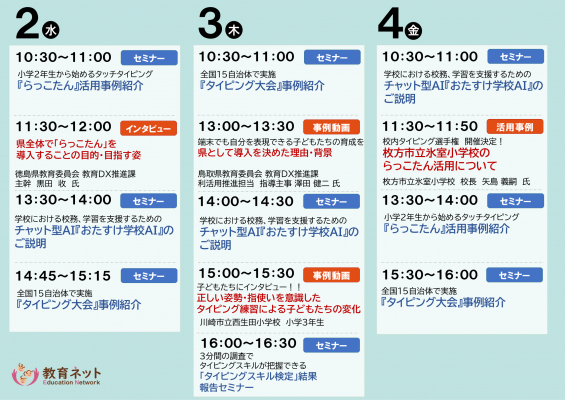 教育ネットのブースではその他、情報活用能力の可視化・育成を目的としたアプリ『らっこたん』と学校における校務と学習を支援するチャット型AI『おたすけ学校AI』の製品紹介や各種セミナーも実施します。教育現場における最新の情報収集ができる同展示会にご来場いただき、ぜひ弊社ブースにお立ち寄りください。