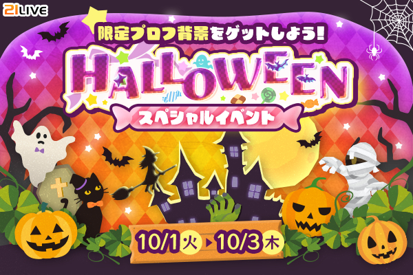 株式会社エムアンドティーティー(本社:沖縄県北谷町、代表取締役:井藤 三知子)が運営するエンターテイメント・ライブ配信アプリ【21LIVE(ニーイチライブ)】URL: https://21.live では、10月1日(火)から10月3日(木)にかけて3日間限定のイベント『限定プロフ背景をゲットしよう!HALLOWEENスペシャルイベント』を開催いたします。