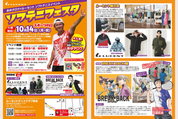 また、同会場ではソフトテニスを一日中楽しめるイベント『ソフテニフェスタ』、人気のテニス漫画『BREAK BACK』の特別展示会を開催いたします。