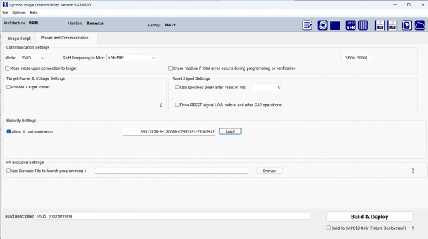 Cyclone Image Creation Utilityを使用してRenesasデバイスをIDコードマッチでアンロックするには、デバイスのセキュリティに使用された32文字のIDコードを「Build & Deploy」をクリックする前に入力します。セキュリティ設定の「Allow ID Authentication」を選択し、128ビットのIDコードを手動で入力するか、既存のプログラム済みファイルをロードすることで自動的に入力できます。