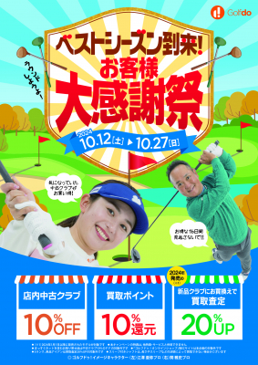 株式会社ゴルフ・ドゥ(本社:さいたま市 代表取締役社長:佐久間功)は、関東1都5県、山梨県、兵庫県、山口県、九州4県にある「ゴルフドゥ!」26店舗において、「ベストシーズン到来!お客様大感謝祭」を2024年10月12日(土)~27日(日)に開催します。