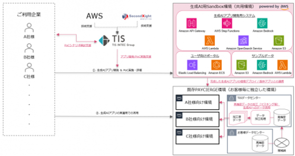 また、今回新サービスメニューとして提供する生成AI導入オプションでは、生成AIを用いたPoCの実施を検討する企業を対象に、TISがサンプルデータの準備やデータ加工をサポートします。企業担当者が生成AIアプリを迅速かつ手軽に開発できる環境として、アマゾン ウェブ サービス(以下:AWS)の「AWSマネージドサービス」およびセカンドサイトアナリティカ株式会社(以下:セカンドサイトアナリティカ)の「R2Engine」※1を用いたSandbox環境※2を提供します。