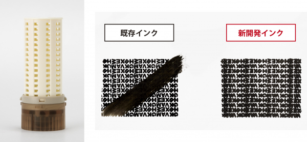 ※感熱紙に捺印して一定時間経過したものを上からこすった比較画像。既存インクは乾きにくく、定着しにくい。(用紙の種類によって個体差あり)